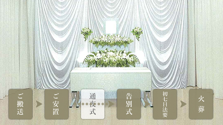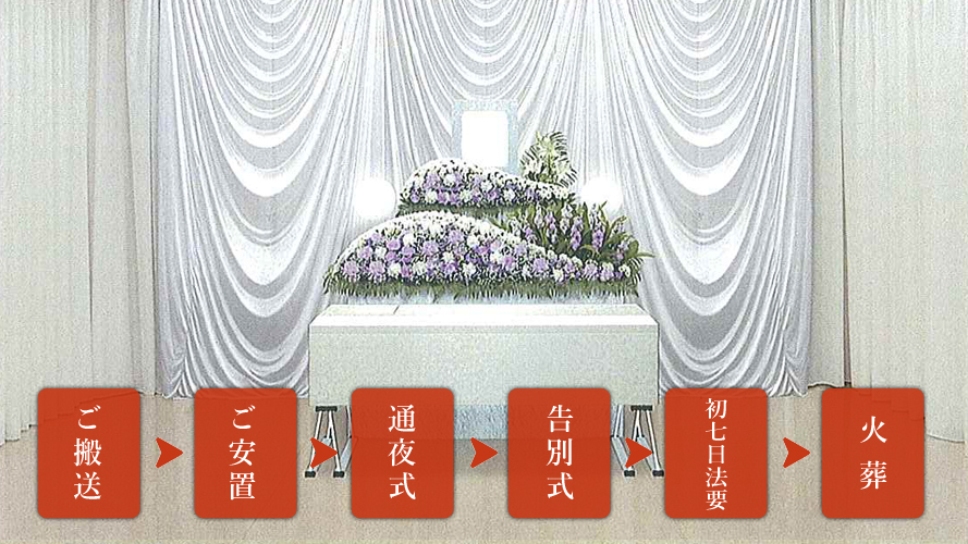 (ご搬送→ご安置→通夜式→告別式→初七日法要→火葬)